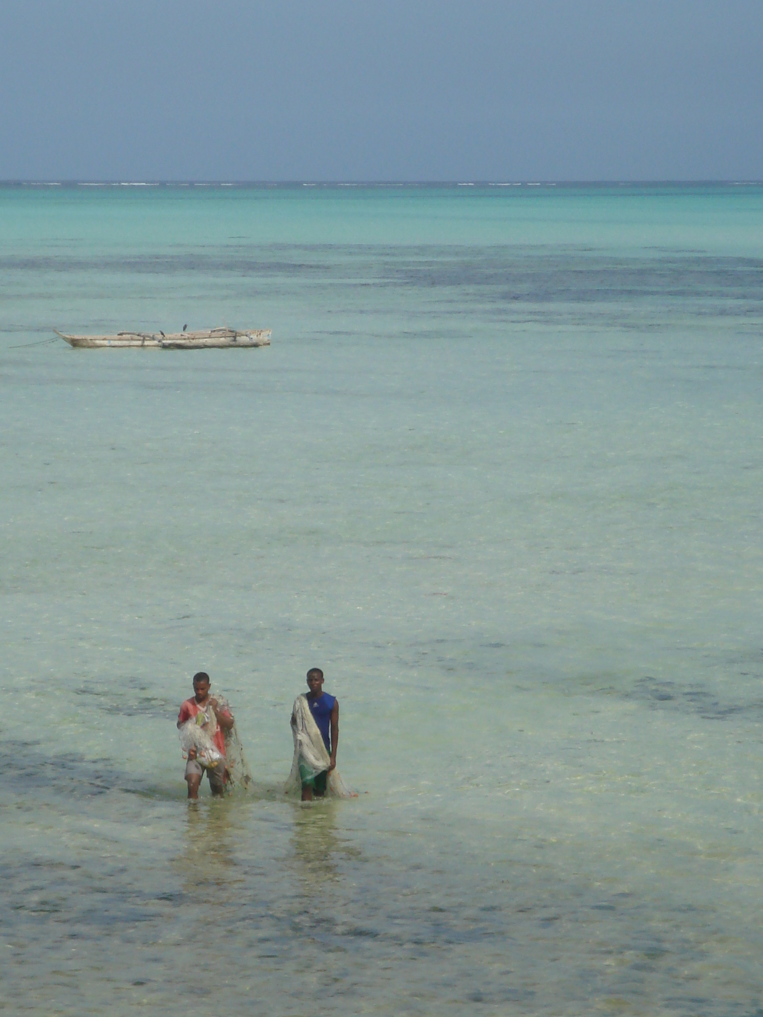 A contrast photo. Crystal blue waters. A snorkeling paradise. Two knackered fisherman who probably can’t swim and definitely couldn’t give a toss whether the waters were crystal blue or green with spots. Theirs is a hard, hard life. They often go fishing at night with lanterns. You can see their canoes and dhows dotting the horizon like long chains of fairy lights. The lanterns confuse the fish into thinking it’s a full moon. And full moon for a fish around here means get your flipper over time. Their favourite place for fish nooky is near the surface so they’ll naturally start swimming towards the light. You know what’s coming. Love is cruel. As soon as they reach the surface, lips puckered, the fisherman wacks them over the head with the lantern and scoops them into the boat. He scoops them out with nets actually but you get the picture.