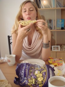 . . . bag of half melted Cadbury’s Chocolate Eclairs, a bag of Haribu Fruit Gums and a loaf of home made bread with real butter on it of course!
