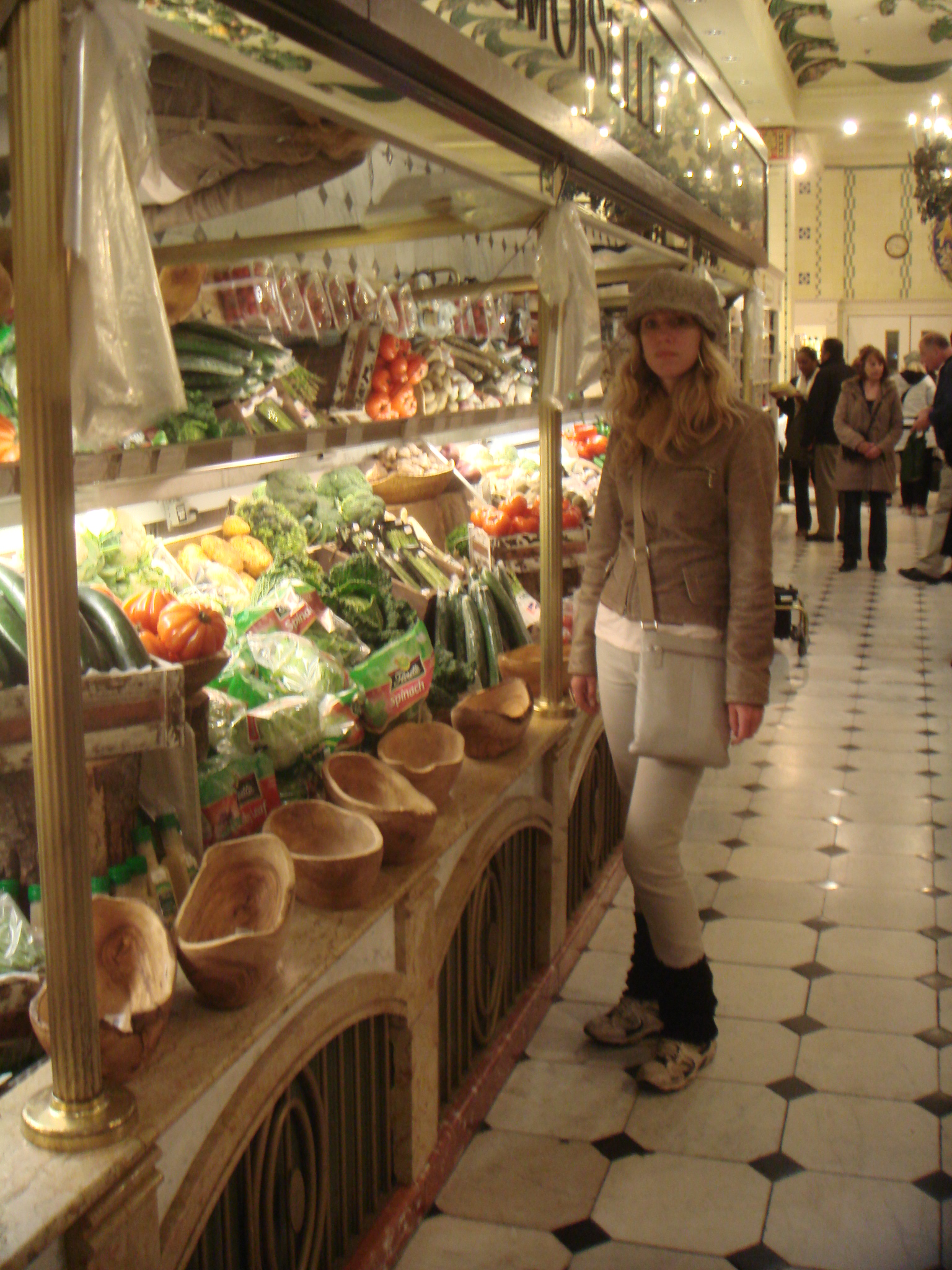The posh South, of course has it all. Nadine in Harrods at the veg counter looking quite cute in her floppy cap. Yes, it’s for shoplifting.