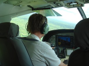 I think it caters for up to 18 passengers. Hovers just above the cloud line after take-off, and when it flies through clouds or rain, boy, do you notice it at times. I can think of a couple of you out there who may not have appreciated that flight. Luckily enough we both don’t suffer from a fear of flying as long as things don’t get too exciting (I do have my limits, I’ll admit it),but the bumpiness was acceptable and the whole trip of 30 minutes was quite a treat. As you can see one could look right over the pilot’s shoulder, straight into the cockpit and beyond: